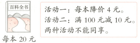 5. 六一儿童节这天书店搞活动,王老师要买5本《百科全书》放在图书角,参加哪个活动比较合算?请列式计算说明理由。(4分)