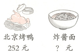 3. 北京小吃闻名天下。李叔叔花300元买了1份北京烤鸭和3份炸酱面,每份炸酱面多少元?(3分)