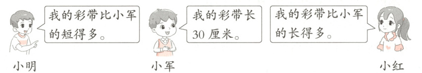 哪根彩带是小红的?请画“√”。哪根彩带是小明的?请画“$◯$”。(4分)