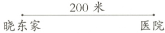 2. 奶奶生病了,晓东给奶奶送饭,他从家步行200米到医院。他每天要走两个来回,一共走了多少米?(5分)