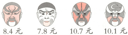 [解析]10.7>10.1>8.4>7.8,先求出买最贵的和最便宜的脸谱一共多少元,再用付的钱数减去买脸谱的钱数,即可求出找回的钱数。