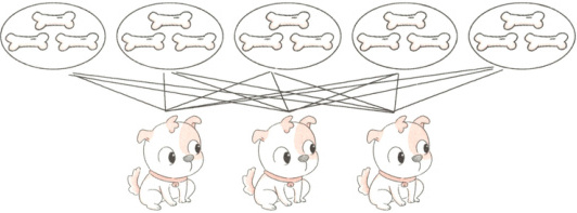 10. 淘淘把15根骨头平均分给3只小狗,分法如图所示。他每次拿()根来平均分,最终每只小狗分得()根骨头。