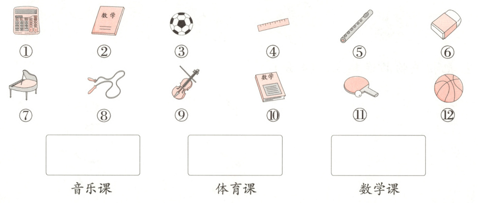2. 下面物品是上什么课用的?把序号填入相应的框里。(12分)