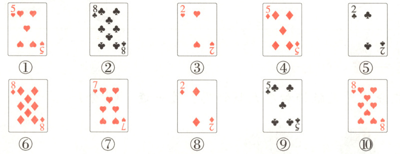 (2)还可以按花色分。红桃:①③⑦⑩;梅花:②⑤⑨;方块:④⑥⑧。(分类方法不唯一)
