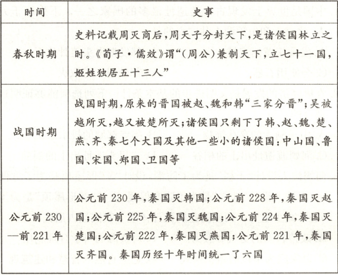 春秋时期,周朝实行分封制,先后分封了几十个诸侯国。随着诸侯势力的增长,周天子权威下降,王室衰微,诸侯之间开始了争霸战争和兼并战争。到战国时期,许多小国、部落被吞并,原来的隙地逐渐消失,到了战国后期,中原大地基本只剩下了韩、赵、魏、楚、燕、齐、秦七个大国及其他一些小的诸侯国。公元前230年,势力逐渐强大的秦国开始讨伐其他诸侯国,经过十年征战,相继灭六国,建立了中国第一个统一多民族的封建国家。