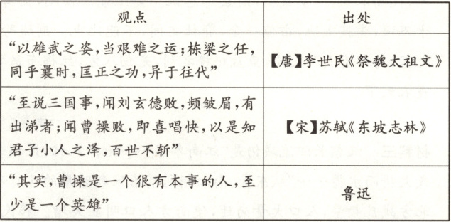 (2)唐朝时,曹操的形象是正面的英雄形象,宋朝时是奸雄的形象。