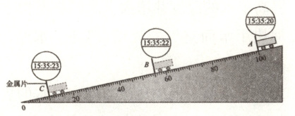 21. 小明在做“测量小车运动的平均速度”的实验中,设计了如图所示的实验装置;小车从带刻度(分度值为 1 cm)的斜面顶端由静止下滑,图中的小方框是小车到达 A、B、C 三处时电子表的显示(数字分别表示“小时:分:秒”)。