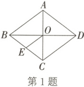 1. (2023·乐山)如图,菱形 $ABCD$ 的对角线 $AC$ 与 $BD$ 相交于点 $O$,$E$ 为边 $BC$ 的中点,连接 $OE$。若 $AC = 6$,$BD = 8$,则 $OE$ 的长为(
