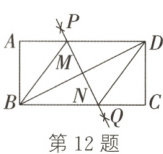 12. (2022·恩施)如图,在矩形 $ABCD$ 中,连接 $BD$,分别以点 $B$,$D$ 为圆心,大于 $\dfrac{1}{2}BD$ 的长为半径画弧,两弧交于 $P$,$Q$ 两点,作直线 $PQ$,分别与 $AD$,$BC$ 交于点 $M$,$N$,连接 $BM$,$DN$。若 $AD = 4$,$AB = 2$,则四边形 $MBND$ 的周长为(