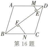 16. (2023·运城稷山期中)如图,在菱形 $ABCD$ 中,$AB = 10$,$BD = 16$,若 $M$,$N$ 分别是边 $AD$,$BC$ 上的动点,且 $AM = BN$,作 $ME \perp BD$,$NF \perp BD$,垂足分别为 $E$,$F$,则 $ME + NF$ 的值为