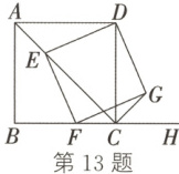 13. B 解析:如图,过点 E 作 EK⊥BC 于点 K,EL⊥CD 于点 L,证明四边形 ELCK 是正方形,则 EK = EL. 证明△FEK≌△DEL,得 DE = FE,即可证明矩形 DEFG 是正方形,故选项 A 正确. 由∠CDG = ∠ADE = 90° - ∠CDE,CD = AD,GD = ED,证明△CDG≌△ADE,得 CG = AE,则 CE + CG = AC 为定值,再根据勾股定理求出 AC 的长为 9$\sqrt{2}$,故选项 D 正确. 由△CDG≌△ADE,得 ∠DCG = ∠DAE = 45°,易得 ∠DCG = ∠GCH = 45°,故选项 C 正确. 根据 ∠ADE = ∠DEL = ∠FEK ≠ ∠CEF,可以判断选项 B 不正确.