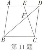 11. (2022·淄博)如图,在边长为 $4$ 的菱形 $ABCD$ 中,$E$ 为边 $AD$ 的中点,连接 $CE$ 交对角线 $BD$ 于点 $F$。若 $\angle DEF = \angle DFE$,则菱形 $ABCD$ 的面积为(