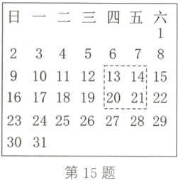 15. 如图所示为某年10月的月历表,在其中用一个方框圈出四个数(如图中虚线框所示),设这四个数从小到大依次为$a$,$b$,$c$,$d$。