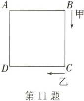 11. (教材 $P_{40}$ 习题2.4第3题变式)如图,甲、乙两人分别从正方形花坛 $ABCD$ 的顶点 $B$,$C$ 同时出发,甲由点 $B$ 向点 $C$ 运动,乙由点 $C$ 向点 $D$ 运动,甲的速度为 $2m/min$,乙的速度为 $1m/min$,当一方运动到终点时,另一方随即停止运动。若正方形花坛的边长为 $10m$,求多久后两人相距 $2\sqrt{10}m$。