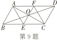 9. (2022·泰安)如图,$□ ABCD$的对角线$AC$,$BD$相交于点$O$,$E$为$BC$的中点,连接$EO$并延长,交$AD$于点$F$,连接$AE$,$CF$,$\angle ABC = 60^{\circ}$,$BC = 2AB$。有下列结论:①$AB\perp AC$;②$AD = 4OE$;③四边形$AECF$是菱形;④$S_{\triangle BOE} = \frac{1}{4}S_{\triangle ABC}$。其中,正确的个数是(