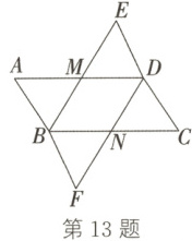 13. 如图,在$□ ABCD$和$□ BFDE$中,$\angle A = \angle F$,$AD$与$BE$交于点$M$,$BC$与$DF$交于点$N$。