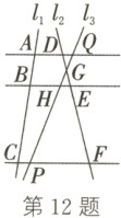 12. 如图,直线$AD// BE// CF$,它们分别交直线$l_{1}$,$l_{2}$,$l_{3}$于点$A$,$B$,$C$,$D$,$E$,$F$,$Q$,$H$,$P$,$l_{2}$与$l_{3}$相交于$DE$的中点$G$,且$\frac{AB}{AC}=\frac{2}{7}$.