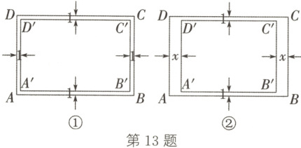 (2)如图②,若两个矩形上下宽度为$1$,左右宽度为$x$,当$x$为多少时,矩形$ABCD$与矩形$A'B'C'D'$相似?