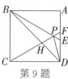 9. 如图,在正方形$ABCD$中,$\triangle BPC$是等边三角形,$BP$,$CP$的延长线分别交$AD$于点$E$,$F$,连接$BD$,$DP$,$BD$与$CF$相交于点$H$。给出下列结论:①$BE = 2AE$;②$\triangle DFP\backsim\triangle BPH$;③$\triangle PFD\backsim\triangle PDB$;④$DP^{2} = PH· PC$。其中,正确的是(
