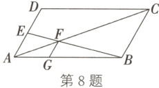 8. 如图,在$□ ABCD$中,$E$是$AD$的中点,$AC$与$BE$交于点$F$,过点$F$作$FG// BC$,交$AB$于点$G$。若$BC = 6$,则$FG$的长为(