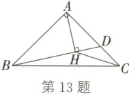 13. 如图,在等腰直角三角形$ABC$中,$∠BAC = 90^{\circ}$,$D$是边$AC$上一点,$AH⊥BD$于点$H$,连接$CH$。