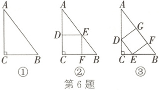 6. 题图②的截法更好些 理由:设题图②中正方形的边长为 $x_1$cm. 由题意,易得 $\triangle ADE \sim \triangle EFB$. $\therefore \frac{AD}{EF} = \frac{DE}{FB}$. $\because BC = 3$cm,$AC = 4$cm, $\therefore \frac{4 - x_1}{x_1} = \frac{x_1}{3 - x_1}$, 解得 $x_1 = \frac{12}{7}$. 在题图③中过点 $C$ 作 $CM \perp AB$ 于点 $M$, 交 $DE$ 于点 $N$. 设题图③中正方形的边长为 $x_2$cm. $\because \angle ACB = 90°$,$BC = 3$cm,$AC = 4$cm, $\therefore$ 在 $Rt \triangle ABC$ 中,由勾股定理,得 $AB = \sqrt{AC^2 + BC^2} = 5$cm. $\therefore$ 易得 $CM = \frac{3 × 4}{5} = 2.4$(cm). 由题意,可知 $DE // AB$, $\therefore \angle CDE = \angle CAB$. $\because \angle DCE = \angle ACB$, $\therefore \triangle DCE \sim \triangle ACB$. $\therefore \frac{DE}{AB} = \frac{CN}{CM}$. $\therefore \frac{x_2}{5} = \frac{2.4 - x_2}{2.4}$, 解得 $x_2 = \frac{60}{37}$. $\therefore \frac{60}{37} \approx \frac{12}{7}$, $\therefore$ 题图②中正方形的面积较大. $\therefore$ 题图②的截法更好些.