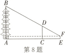 8. (2023·潍坊)在《数书九章》中记载了一个测量塔高的问题:如图,$AB$ 的长表示塔的高度,$CD$ 的长表示竹竿顶端到地面的高度,$EF$ 的长表示人眼到地面的高度,$AB$,$CD$,$EF$ 在同一平面内,点 $A$,$C$,$E$ 在同一条水平直线上。已知 $AC = 20$ 米,$CE = 10$ 米,$CD = 7$ 米,$EF = 1.4$ 米,人从点 $F$ 远眺塔顶 $B$,视线恰好经过竹竿的顶端 $D$,可求出塔的高度。根据以上信息,塔的高度为