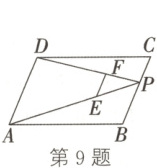 9. 如图,$P$ 为 $□ ABCD$ 的边 $BC$ 上一点,$E$,$F$ 分别为线段 $PA$,$PD$ 上的点,且 $PA = 3PE$,$PD = 3PF$,$\triangle PEF$,$\triangle PDC$,$\triangle PAB$ 的面积分别记为 $S$,$S_{1}$,$S_{2}$。若 $S = 2$,则 $S_{1}+S_{2}=$