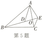5. 如图,$D$ 是 $\triangle ABC$ 内一点,点 $E$ 在线段 $BD$ 的延长线上,$BE$ 与 $AC$ 交于点 $O$,连接 $AD$,$CE$。如果 $\frac{AD}{AB}=\frac{AE}{AC}=\frac{DE}{BC}$,那么下列结论中,正确的是(