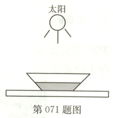 071. 正午,小明对水面获取太阳的能量情况进行研究,他将装有400 g水的盘子放在室外平台上,经阳光照射10 min后,水温升高了2.5℃。不计水的蒸发[水的比热容是4.2×10³ J/(kg·℃)]。