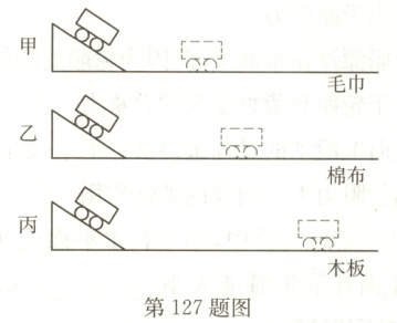 127. 为探究“力与运动的关系”,设计了如图所示的斜面实验,让小车从斜面滑到接触面分别为毛巾、棉布和木板的水平面上,观察小车在水平面上滑行的距离。
