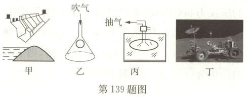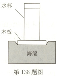 138. C 解析:水杯对木板的压力大小等于水杯受到的重力大小,但是压力不是重力;水杯对木板的压强$p = \frac{F}{S} = \frac{G_1}{S_1}$;水杯对木板的压力和木板对水杯的支持力是一对相互作用力;木板对海绵的压强为$\frac{G_1 + G_2}{S_2}$。