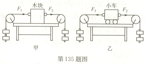 135. 在“探究二力平衡的条件”实验中,同学们设计了如图所示的甲、乙两种实验方案。小张同学认为乙方案更合理,理由是乙方案中使用小车时