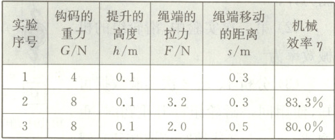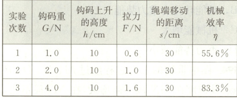 (3)由表中数据可知,钩码重力增大(1.0N→2.0N→4.0N),机械效率提高(55.6%→66.7%→83.3%),故重物越重,机械效率越高。