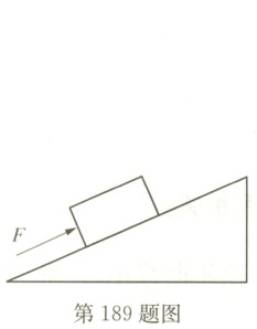 189. 如图所示,把重为40N的物体从斜面底端匀速推到斜面顶端,斜面长2m,高0.6m,沿斜面的推力F为20N。那么,此过程中有用功是J,斜面的机械效率是。