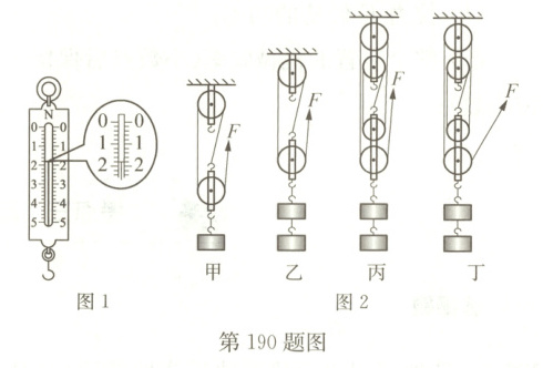 190. 如图所示,在“测量滑轮组机械效率”的实验中,利用图2中甲、乙、丙三个实验装置分别进行实验,测得的实验数据分别如表所示(钩码规格相同、动滑轮个数越多重力越大)。