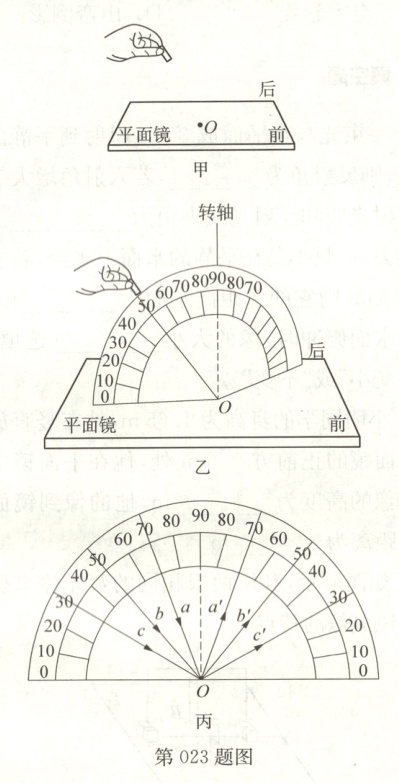 (选填“前”或“后”)折转。(3) 保持入射点不变,多次改变入射方向,在光屏上记录每次实验的光路a - a'、b - b'和c - c',如图丙所示。为了研究反射光线和入射光线的位置关系,发现左、右半屏相对应的光线关于转轴对称,可将此对称轴视为