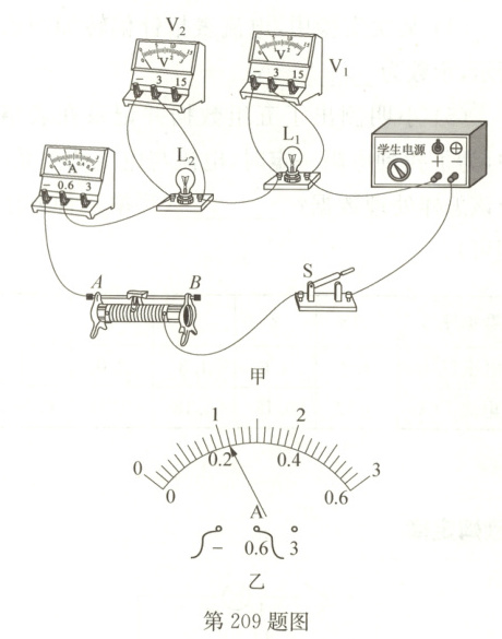 209. 实验小组在实验时,不慎将灯泡 $ L_2 $ 的玻璃外壳碰碎。他们惊奇地发现虽然 $ L_2 $ 几乎不发光,但与其串联的灯泡 $ L_1 $ 不仅没有熄灭,反而更亮。开关断开后的电路如图甲所示,$ L_1 $ 和 $ L_2 $ 都标有“$ 2.5\ V\ \ 0.3\ A $”字样。针对上述现象,探究下列问题:玻璃破碎后,$ L_2 $ 的灯丝电阻发生了什么变化?玻璃外壳究竟起什么作用?