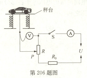 206. 如图是地磅工作的原理示意图,秤台连在竖直弹簧上,电路与恒压电源连接。未称量时,滑动变阻器 $ R $ 的滑片 $ P $ 在最上端,称量时,滑片 $ P $ 向下滑动。闭合开关 $ S $,车辆的总质量越大时(