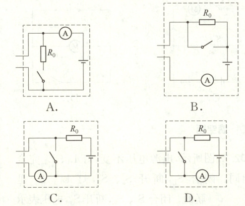 207. (多选)如图所示的“电阻测量盒”,内有电源(电压不变且未知)、阻值已知的定值电阻 $ R_0 $、开关和电流表,并引出两根导线到盒外。将盒外的两根导线分别与待测电阻 $ R_x $ 的两端相连,根据开关闭合、断开时电流表的示数,可以算出 $ R_x $ 的阻值。如图所示是设计的盒内电路图,其中符合要求的是(