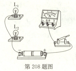 208.如答图所示。 解析:由题知,两个灯泡并联,开关在干路上控制整个电路;电流表测通过灯$L_1$的电流,则电流表与灯泡串联在一条支路中。
