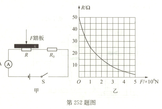 252. 公路部门往往通过地磅检测汽车载重情况。图甲是跨学科学习团队设计的可视化地磅的电路原理图,主要由踏板(重力不计)、压力传感器R、显示承重的仪表(实质为电流表,量程为0~0.6A)等组成,R的阻值与所受压力F的大小关系如图乙所示。电源电压为12V,定值电阻R₀的阻值为5Ω。(g取10N/kg)