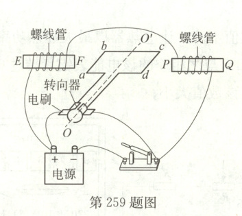 259. 如图所示为某电动机的原理图,EF、PQ为螺线管,abcd为电动机的线圈,OO'为转轴。闭合开关,从O点沿转轴方向观察,线圈顺时针转动,则(