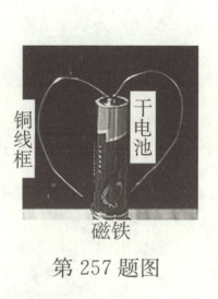 257. 如图所示,某兴趣小组利用干电池、铜线框和磁铁制作一个“爱心”电动机,“爱心”能绕电池转动。下列家用电器中与“爱心”电动机工作原理相同的是(