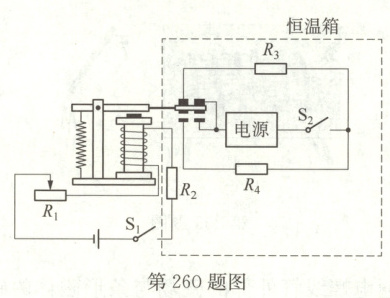 260. 寒冬,为给小鸡仔提供温暖的环境,小明制作了恒温箱系统,原理如图所示。控制电路由电磁继电器、滑动变阻器R₁、热敏电阻R₂(安装在恒温箱内,阻值随温度升高而显著减小)、低压电源等组成。加热电路由电源、电热丝R₃和R₄等组成。调好R₁的阻值,闭合开关S₁、S₂,箱内温度升高到设定值后即在小范围内波动,且降温阶段降温比较平缓。