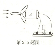 265.C解析:装置A中有磁铁和可转动的线圈,当有风吹向风扇时扇叶转动,扇叶带动线圈在磁场中转动切割磁感线,会产生感应电流,使接入的LED灯发光,是利用电磁感应现象的原理工作的,说明磁能够产生电;在此过程中,机械能转化为电能。故选C。