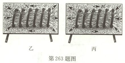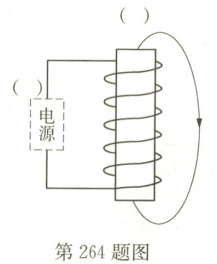 264.如答图所示。 解析:磁感线从螺线管的上端出发,所以螺线管的上端为$N$极,下端为$S$极,根据右手螺旋定则,螺线管中的电流应是下端流入,上端流出,则电源的下端为正极,上端为负极,如答图所示。