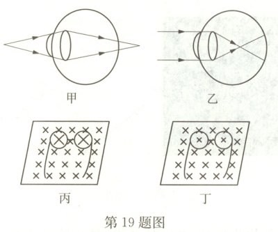 19.乙 丁 解析:题图乙将光线会聚在视网膜前方,因此题图乙表示近视眼,近视眼应该配戴凹透镜进行矫正,凹透镜成正立、缩小的虚像,题图丁所示符合题意。