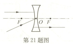 21. 解析:平行于主光轴的光线经凹透镜折射后,其折射光线的反向延长线过焦点;过光心的光线传播方向不改变;经凹透镜折射后平行于主光轴的光线,其入射光线的延长线过焦点,如答图所示。