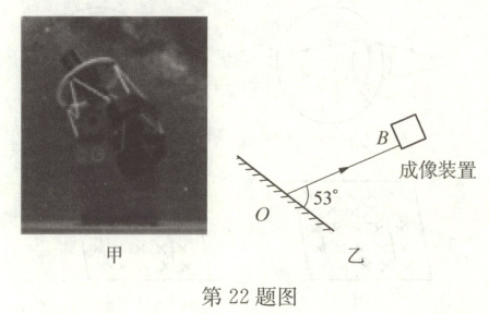 22. 2023年9月17日,我国墨子巡天望远镜正式启用,它是北半球巡天能力最强的光学时域望远镜,如图甲所示。一束星光入射到望远镜,经主镜反射后到达成像装置,如图乙所示,OB是反射光线,请画出其入射光线AO并标出入射角大小(保留作图痕迹)。